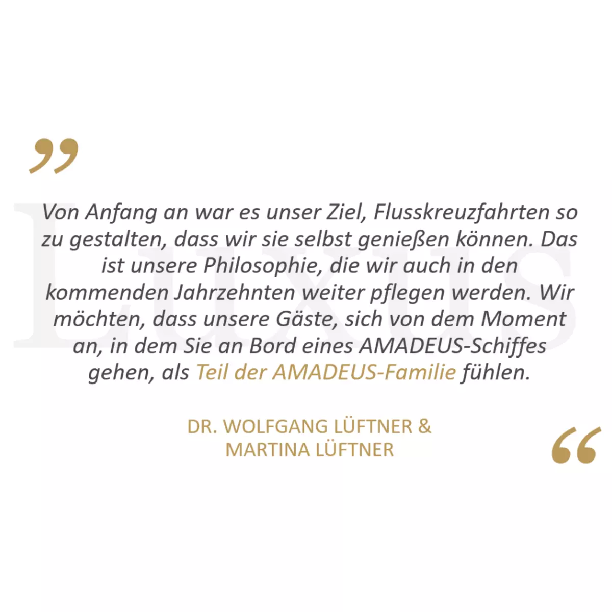 Wenn Ihre Kunden eine Flusskreuzfahrt mit AMADEUS unternehmen, umgibt sie von Beginn an eine besonders familiäre Atmosphäre. Das liegt auch daran, dass wir im laufe unserer 40-Jährigen Geschichte, Flusskreuzfahrten immer wieder neu definiert haben - mit unserer Liebe zum Luxus, reichlich Erfahrung sowie einem Fingerspitzengefühl für Details, die eine Reise erst besonders machen. Gleich bleibt aber immer unsere österreichische Gastfreundschaft, mit der sich unsere Gäste von Beginn an als Teil der Familie fühlen sollen. Und so reist neben all den großen Urlaubsmomenten eben auch die Gewissheit mit, sich an Bord immer zu Hause zu fühlen.