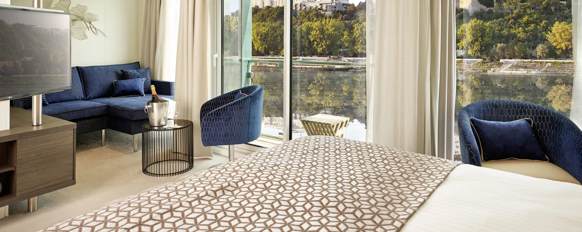 - Luxuriöse Unterkunft in einer Außenkabine Ihrer Wahl mit Flussblick: Geräumige Suiten auf dem Mozart-Deck mit begehbarem Balkon, Kabinen auf dem Mozart- und Strauss-Deck mit absenkbarer Panorama-Fensterfront