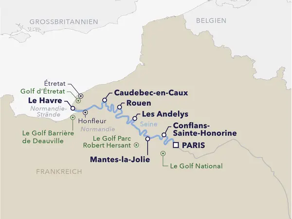 Verbinden Sie die Liebe zum Reisen mit Ihrer Leidenschaft für Golf – auf unserer ebenso spannenden wie entspannten Golfkreuzfahrt von Paris bis in die Normandie und zurück. Dabei holen Sie kulturell und sportlich weit aus und entdecken neben den Prachtstädten entlang der Seine einige der besten Golfplätze weltweit. Immer an Ihrer Seite: ein erfahrener Golfexperte, der Ihnen mit seinem Know-how die Bälle zuspielt. Dazu spielen für Sie die wildromantischen Naturschönheiten Nordfrankreichs groß auf. Holt Ihre Reiselust bereits Schwung? Dann starten Sie mit uns zu dieser 8-tägigen Golftraumreise.