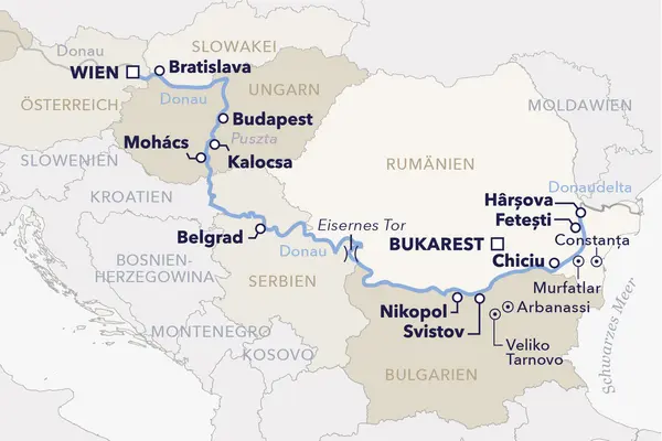Ihre Reise beginnt in der lebendigen rumänischen Hauptstadt Bukarest, wo Sie in das pulsierende Stadtleben eintauchen. Danach geht es auf dem Landweg zu Ihrem schwimmenden Hotel, das Sie durch die weltberühmten Metropolen Belgrad, Bratislava und Budapest bis nach Wien bringt. Staunen Sie über die spektakuläre Passage des „Eisernen Tors“ in den wilden Karpaten, Europas imposanten Taldurchbruch, der Naturgewalt und Schönheit zugleich vereint. Im Donaudelta, UNESCO-Weltnaturerbe, erwartet Sie ein Bootsausflug zu einer einzigartigen Tier- und Pflanzenwelt – hautnah und unvergesslich.