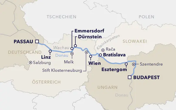 Natur trifft Kultur – und beides trifft ganz sicher Ihren Entdecker-Geschmack. Gehen Sie mit uns 8 unvergessliche Tage lang auf Luxus-Kreuzfahrt – von der Dreiflüssestadt Passau bis nach Budapest, der bezaubernden Hauptstadt Ungarns. Auf Ihrer Reise durch Deutschland, Österreich, die Slowakei und Ungarn begegnen Sie an Schauplätzen wie Wien, Bratislava und Linz steinernen Zeitzeugen der Jahrtausende. Stets im wunderbaren Wechselspiel mit dem Reichtum der Natur: Entdecken Sie zum Beispiel die wie in die Landschaft gemalte Schlögener Schlinge bei Passau, das UNESCO-Welterbe Wachau und das einzigartige Donauknie bei Visegrád. Messen sie ruhig schon mal Ihr Reisefieber.