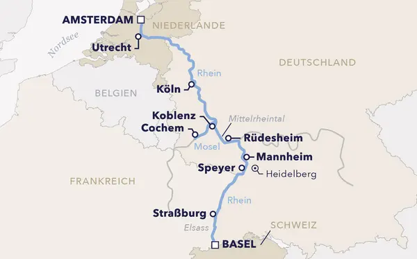 Erleben Sie 8 unvergessliche Tage auf dem Rhein – von den Grachten Amsterdams bis ins Dreiländereck nach Basel. Genießen Sie die historischen Altstädte von Köln, Koblenz und Straßburg, entdecken Sie das malerische Moseltal mit seinen Weinbergen und romantischen Burgen, und lassen Sie sich von den charmanten Städten Rüdesheim, Speyer und Heidelberg verzaubern.