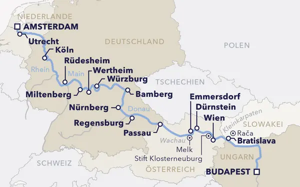 Lassen Sie Ihre Urlaubsträume auf einer Reise durch Europa Wirklichkeit werden. Wir entführen Sie auf eine Flusskreuzfahrt voller Abwechslung und eindrucksvoller Erlebnisse – von der Grachtenstadt Amsterdam bis ins „Paris des Ostens“, Budapest. Auf dieser rund 2.000 Kilometer langen Route voller Abenteuer und Komfort werden Sie zum Entdecker der Vielfalt. Staunen Sie über die idyllischen Wasserwege Hollands und Belgiens, wo Windmühlen verträumt gegen den Strom der Zeit stehen. Bestaunen Sie das Obere Mittelrheintal mit seinen Weinbergen, steilen Felsen und unzähligen Burgen. Genießen Sie die Donau mit der weltberühmten Schlögener Schlinge und der malerischen Wachau. Tauchen Sie ein in die lebendige Kultur von Amsterdam, Köln, Wien, Bratislava und Budapest. Sind Ihre Urlaubsträume bereit, die Segel zu setzen?