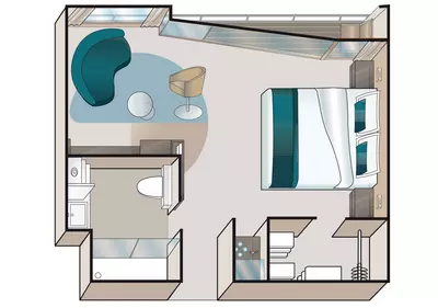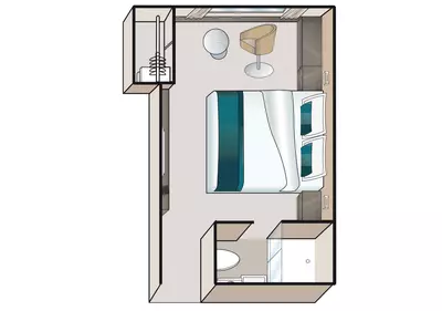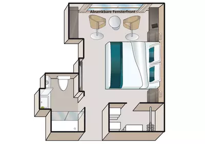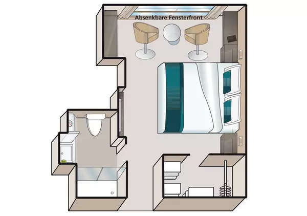 Großzügiges Badezimmer, Aussichtsfenster (Öffnen nicht möglich), Minibar, begehbarer Kleiderschrank, wahlweise Doppelbett oder zwei Einzelbetten, Flachbildschirm-TV, individuell regulierbare Klimaanlage, Dusche/WC, Haartrockner, Telefon und Safe.
