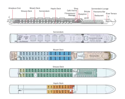 Lassen Sie sich im Panorama-Restaurant kulinarisch verführen, genießen Sie ein edles Tröpfchen im AMADEUS-Club, tanzen Sie in der Panorama-Bar durch unvergessliche Abende oder vergessen Sie unter freiem Himmel einfach die Zeit auf der „River Terrace“. In unserem Massageraum beweisen unsere Masseurinnen und Masseure großes Fingerspitzengefühl für Ihr Wohlbefinden. Im Fitness-Raum können Sie Ihre Muskeln spielen lassen. Und auf dem neu konzipierten Sonnendeck mit der tiefer liegenden Lounge wird Ihr Tag garantiert himmlisch. Wann legen Sie mit uns zu neuen Reiseträumen ab?