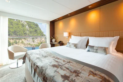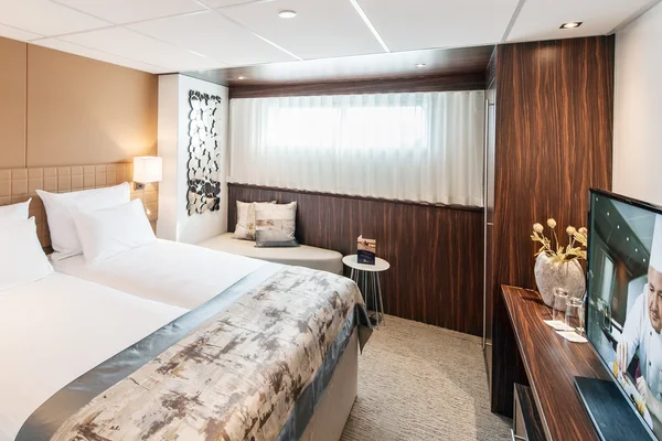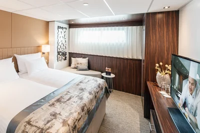 Großzügiges Badezimmer, Aussichtsfenster (Öffnen nicht möglich), begehbarer Kleiderschrank, wahlweise Doppelbett oder zwei Einzelbetten, Flachbildschirm-TV, individuell regulierbare Klimaanlage, Dusche/WC, Haartrockner, Telefon und Safe. Kabinen mit Verbindungstüren sind auf Anfrage verfügbar.