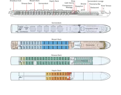 Erleben Sie mit der AMADEUS Riva Genussreisen auf Europas schönsten Flüssen. Mal ganz für sich – in 12 großen Suiten und 67 geräumigen Außenkabinen mit begehbaren Außenbalkonen oder absenkbaren Panoramafenstern. Mal gemeinsam in großer Runde – zum Beispiel im eleganten Panorama-Restaurant, das Platz für alle Passagiere zugleich bietet; in der Panorama-Bar mit Tanzfläche oder auf dem weitläufigen Sonnendeck mit Lounge und Außenrestaurant. Im hochmodernen Fitness-Raum kann Ihr Herz für den Sport schlagen. Und danach lädt Sie die glasgeschützte „River Terrace“ zum Tagträumen ein. Oder Sie überraschen Ihren Gaumen mit selbstgebackenen Köstlichkeiten im „Café Vienna“.