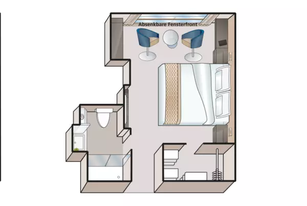 Großzügiges Badezimmer, absenkbare Panorama-Fensterfront, Minibar, begehbarer Kleiderschrank, wahlweise Doppelbett oder zwei Einzelbetten, Flachbildschirm-TV, individuell regulierbare Klimaanlage, Dusche/WC, Haartrockner, Telefon und Safe.