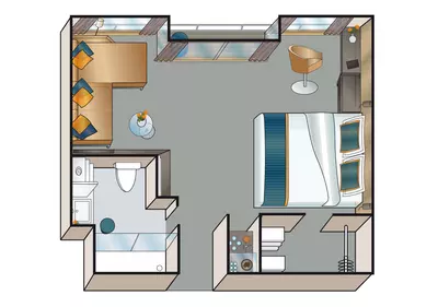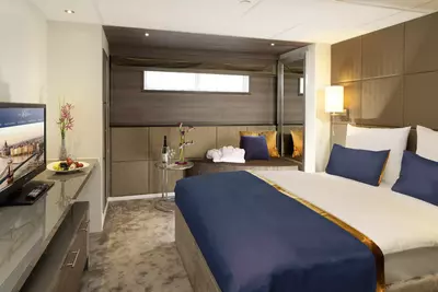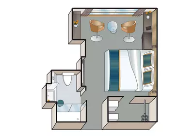 Großzügiges Badezimmer, Aussichtsfenster (Öffnen nicht möglich), begehbarer Kleiderschrank, wahlweise Doppelbett oder zwei Einzelbetten, Flachbildschirm-TV, individuell regulierbare Klimaanlage, Dusche/WC, Haartrockner, Telefon und Safe. Kabinen mit Verbindungstüren sind auf Anfrage verfügbar.
